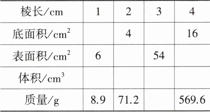 提示:(1) 根据正方体底面积 $ = $ 棱长 $ × $ 棱长,正方体表面积 $ = $ 棱长 $ × $ 棱长 $ ×6 $,正方体体积 $ = $ 棱长 $ × $ 棱长 $ × $ 棱长,代入数据即可求解。(2) 判断两个相关联的量之间是否成正比例,就看这两个量对应的比值是否一定。由(1) 有铜块的质量和体积,表面积和底面积是两组成正比例的量,因为各自的比值都是定值。(3) 因为铜块的质量和体积成正比例,计算出棱长为 $ 3 $ 厘米的正方体的体积,设铜块的质量是 $ x $ 克,列比例 $ 8.9:1=x:27 $ 即可求解。