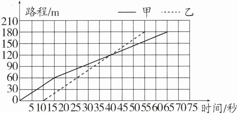 4. 甲、乙两人比赛180米滑板,乙让甲先滑10秒。他们两人滑的路程与时间的关系如图所示: