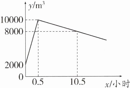 5. 星期天$8:00—8:30$,燃气公司给平安加气站的储气罐注入天然气。在注满储气罐之后,一位工作人员以每车20立方米的加气量,依次给在加气站排队等候的若干辆车匀速加气。储气罐中的储气量$y$(立方米)与时间$x$(小时)的关系如图所示:
