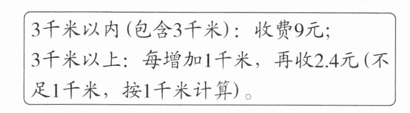 4. 王叔叔打车到瘦西湖游玩,全程共10.4千米,收费标准如下,他使用电子支付软件付款,得到“红包”奖励2.7元,他实际支付车费(