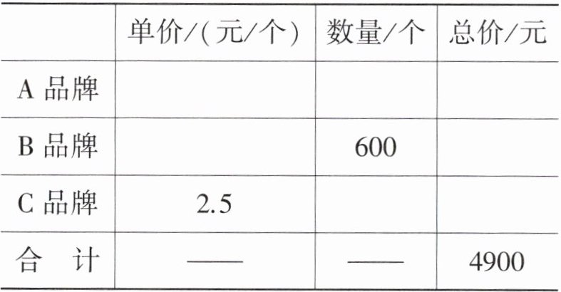 提示:根据“A品牌粽子单价是B品牌粽子单价的$\frac{1}{2}$”可知,销售600个B品牌粽子的总价与销售$(600 × 2)$个A品牌粽子的总价相同,所以销售A、B两种品牌粽子的总价相当于销售$(400 + 600 × 2)$个A品牌粽子的总价,由此可求出A品牌粽子的单价,进而求出B品牌粽子的单价。