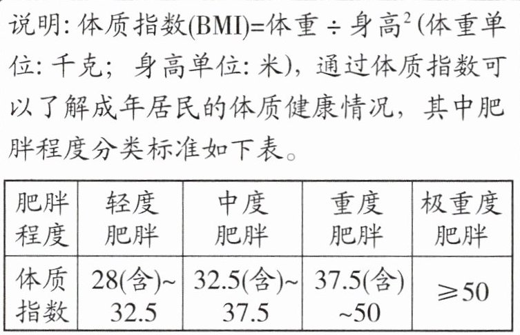 说明:体质指数(BMI)=体重÷身高²(体重单位:千克;身高单位:米),通过体质指数可以了解成年居民的体质健康情况,其中肥胖程度分类标准如下表。