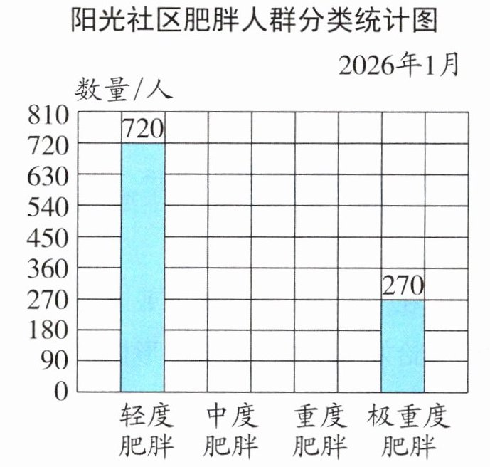 提示:(1)从扇形统计图可知轻度肥胖占比40%,其人数为720人,用对应量除以对应百分率就是总量,所以总人数为$720 ÷ 40\% = 1800$(人)。用单位“1”减去轻度肥胖占比、中度肥胖占比和重度肥胖占比就是极重度肥胖占比,列式为$1 - 20\% - 40\% - 25\% = 15\%$,所以极重度肥胖所在扇形的圆心角是$360° × 15\% = 54°$。(2)用总量乘对应百分率就是对应量,则中度肥胖人数:$1800 × 25\% = 450$(人)。重度肥胖人数:$1800 × 20\% = 360$(人)。根据人数画出对应高度的条形即可。(3)根据体质指数公式可知,小强哥哥的体质指数为$97.2 ÷ (1.8 × 1.8) = 30$。因为$28 < 30 < 32.5$,所以他属于轻度肥胖。(4)这是一道开放性试题,答案不唯一,合理即可,如:①坚持有氧运动,消耗体内多余脂肪;②合理控制饮食,减少高热量食物的摄入。