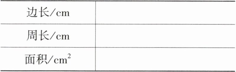 边长/cm 1 2 5 3 6 7 8 周长/cm 4 8 20 12 24 28 32 面积/cm² 1 4 25 9 36 49 64