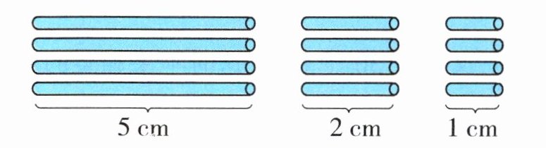 3. 从4根5厘米、4根2厘米和4根1厘米长的小棒中,选出若干根,并使它们首尾相接,能够摆出多少种大小不同的正方形?围成的正方形的周长和面积分别是多少?填写下表。
