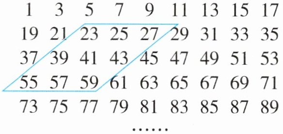 答案:5. (1) 平行四边形框内的九个数之和是 $ 23 + 25 + 27 + 39 + 41 + 43 + 55 + 57 + 59 = 369 $,它们的平均数是 $ 369 ÷ 9 = 41 $,即平行四边形框内的九个数之和是中间的数的 9 倍。