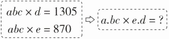 由题意得,$abc × d = 1305$,$abc × e = 870$,则$abc$是1305和870的公因数。