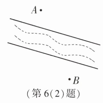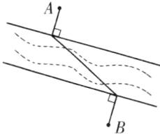 (2)由于小鸭擅长游泳,在岸上行走却很吃力,所以应从A、B两点向河岸分别作两条直线的垂直线段,然后把两个垂足连起来,如图所示。这样就能保证小鸭在岸上行走的路线最短,最省力。