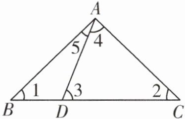 9. 等量代换 如图,在三角形 ABC 中,点 D 在 BC 上,且 $∠ 1 = ∠ 2, ∠ 3 = ∠ 4, ∠ 5 = 24^{\circ}$,求 $∠ 1$ 的度数。