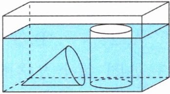 12. 如图,长方体玻璃容器内装有水,容器的内壁底面是一个长方形,长为15厘米,宽为7厘米。现在把等底等高的一个圆柱和一个圆锥放入容器内,水面升高2厘米,又知放入容器后圆锥全部浸入水中,而圆柱有$\frac{1}{6}$露出水面。那么圆柱和圆锥的体积各是多少?