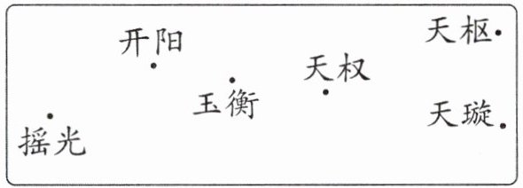 7. 据古籍《鹖冠子》(“鹖”读hé)记载,古人通过观察北斗七星出现在天空中的方位来确定季节。下面是科学课上小枫画的北斗七星示意图,但是他漏画了天玑星,老师说:“天玑星在玉衡星的4点钟方向,天权星在天玑星的11点钟方向。”你能帮他补全北斗七星示意图吗?
