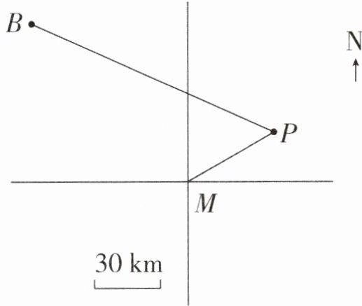 提示:用尺子可量出MP的长度为1.5厘米,所以MP的实际距离为1.5×30=45(千米),用量角器可量出点P在点M的北偏东60°方向上。