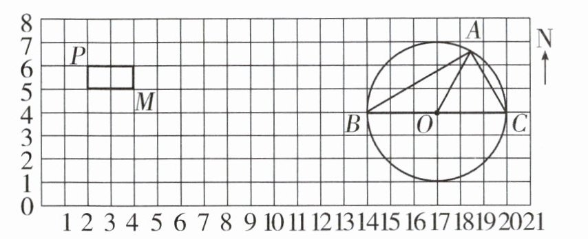 3. 直角三角形的斜边 BC 是圆的直径,O 是圆心,AO = AC。如果每个小方格表示边长为 1 厘米的小正方形,那么点 A 在点 O(