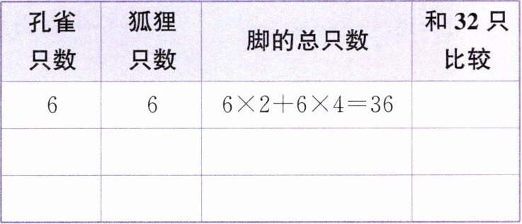 (2)先假设孔雀和狐狸的只数如下表,你能经过调整得出结果吗?