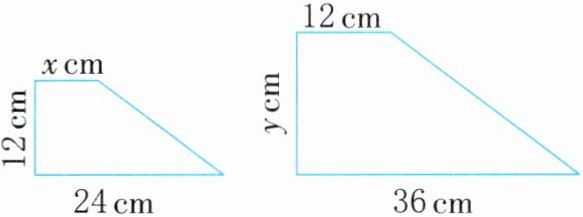 4. 把左边的梯形按比例放大后得到右边的梯形,求未知数x和y。