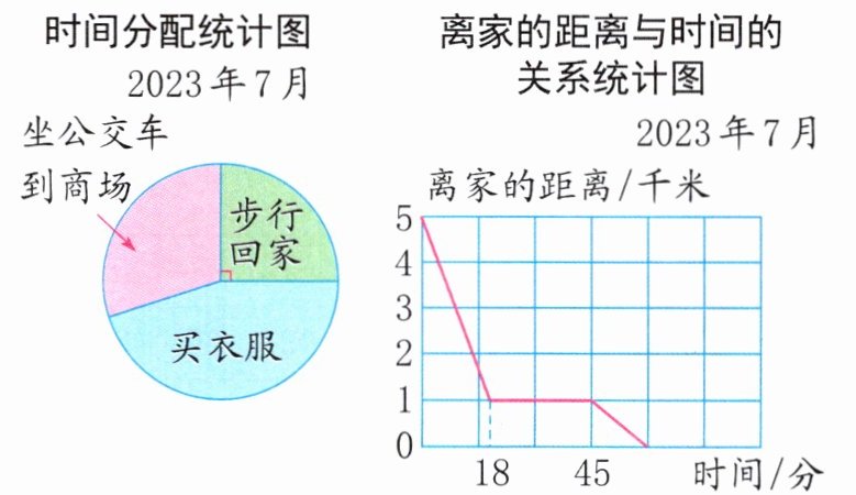 4. (数形结合)林阿姨从单位下班先坐公交车到商场买衣服,再步行回家。下面的两幅统计图记录了她下班后到家前的时间分配和离家的距离与时间的关系。