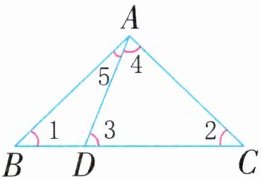 4. 如图,在三角形$ABC$中,点$D$在$BC$上,且$\angle1=\angle2$,$\angle3=\angle4$,$\angle5=24^{\circ}$,求$\angle1$的度数。