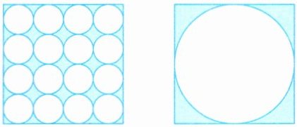 因为每个小圆面积是$\pi$,设小圆半径为$r$,则$\pi r^2 = \pi$,得$r = 1$,直径为$2$。左图中小圆有$4$行$4$列,所以正方形边长为$4×2 = 8$。右图中圆的直径等于正方形边长$8$,半径为$4$,圆面积为$\pi×4^2 = 16\pi$。正方形面积为$8^2 = 64$,涂色部分面积为$64 - 16\pi$。