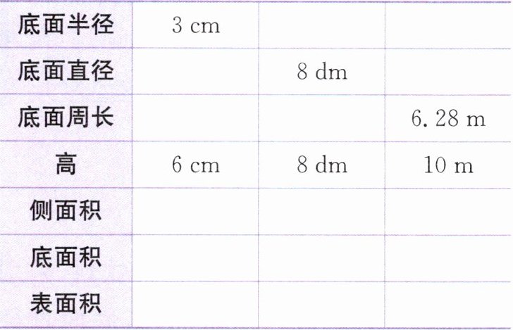 1. 有关圆柱的数据如下表,完成表格。