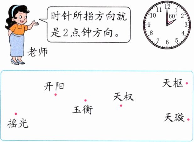 2. (自然科普)下面是科学课上小枫画的北斗七星示意图,但是他漏画了天玑星,老师说:“天玑星在玉衡星的4点钟方向,天权星在天玑星的11点钟方向。”你能帮他补全吗?