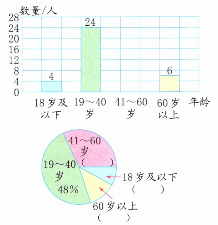 解析:分别用4和6除以总人数就得18岁及以下和60岁以上所占百分数,再用100%减去18岁及以下、60岁以上、19~40岁所占百分数,求出41~60岁所占的百分数。根据总人数乘百分数求得41~60岁的人数。