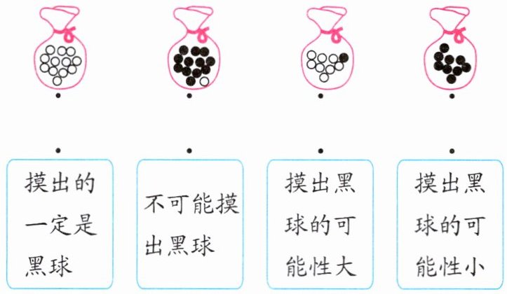 1. (操作探究)从袋子里任意摸一个球,结果会怎样?连一连。