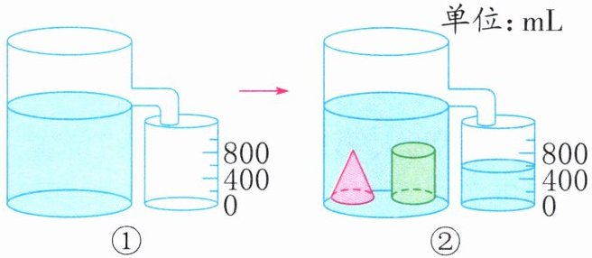 (1)(芜湖无为)思思用图①的装置做排水实验,她把等底等高的圆柱和圆锥铁块浸没在水中(如图②),则圆锥的体积是(