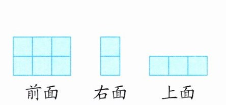 (2)(淮安洪泽区)小军用棱长为1厘米的小正方体摆长方体,从前面、右面和上面看到的形状如左下图所示。这个长方体的表面积是(