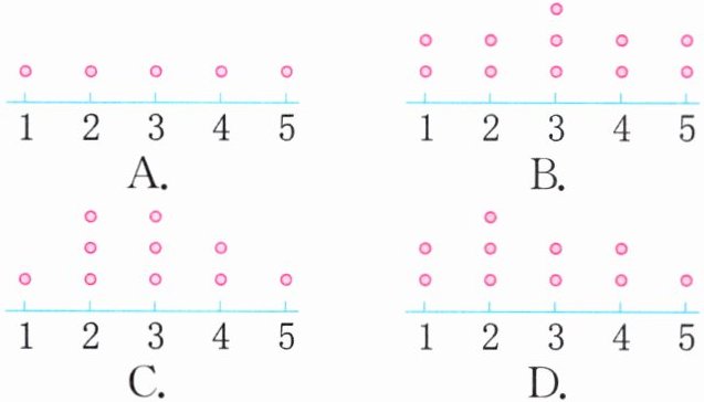 (3)(南京浦口区)有10个人接受了市场调查访问:在过去的一个月里,你去了超市多少次?调查结果是3次、4次、2次、2次、2次、3次、1次、5次、3次、4次。下面的点子图中,正确表达了这个调查报告的数据的是(