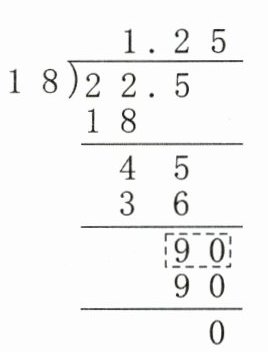4. 李老师把22.5米长的彩条平均分成18段,每段长多少米?小泽用右边的竖式解决了这个问题,竖式中框出的数表示90(
