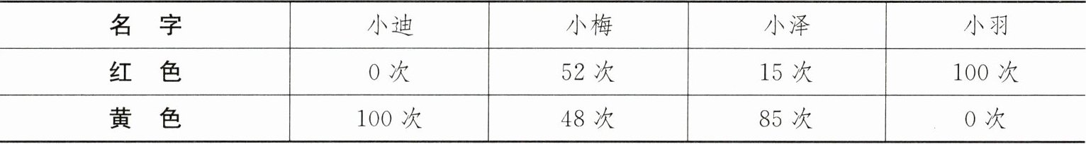 3. 小迪、小梅、小泽和小羽分别选一个小正方体各抛了 100 次,朝上一面的颜色情况如下表: