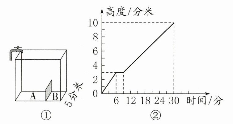 10. 右上图①是一个宽 5 分米的长方体透明容器,被一块垂直于底面的薄铁皮(不计厚度)分割成 A、B 两部分。现在每分钟向 A 部分注水 20 升。右上图②记录了从注水开始直到容器装满,A 部分的水面高度的变化情况。