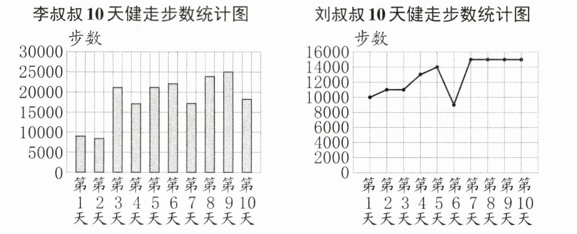 4. 李叔叔和刘叔叔都喜欢健走运动,他们两人每天都会使用手机的计步软件记录所走步数。下面是他们两人使用不同计步软件记录10天的健走步数统计图。