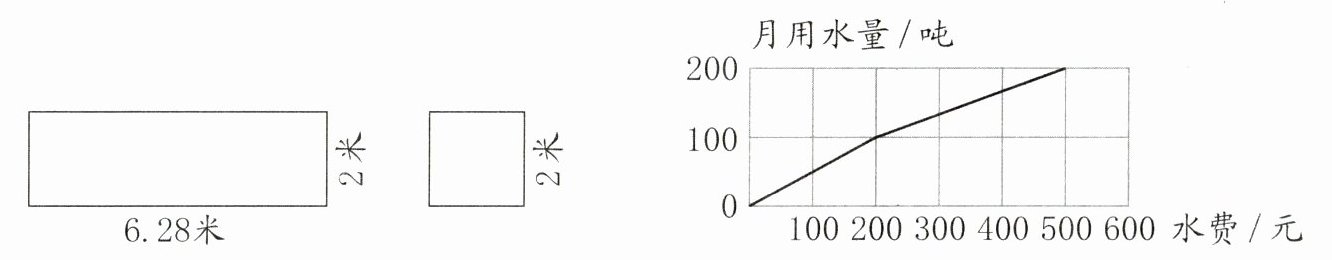 10. 李师傅用如图所示的两块铁皮加工了一个无盖的最大的圆柱形容器(铁皮厚度不计,损耗不计),作为小学的简易水池。在 2023 年 6 月,六年级平均每天用一池水,下面的折线统计图表示自来水厂规定的月用水量与水费的关系。六年级 6 月用水(