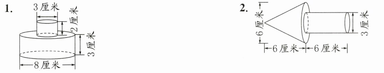 2. 体积$:3.14×(6÷2)^2×6×\frac{1}{3}+3.14×(3÷2)^2×6=98.91($立方厘米)