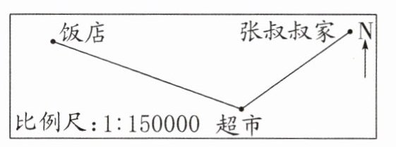 测量得从饭店经超市到张叔叔家的图上距离为5厘米。