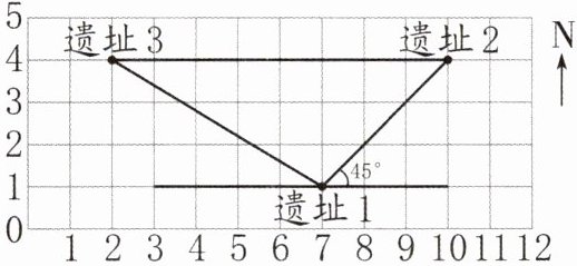 1. 右图是某地区最新考古挖掘的三个文化遗址的平面图。在图上,遗址1的位置是$(7,1)$,遗址3的位置是( , )。以遗址1为观测点,遗址2在遗址1的(