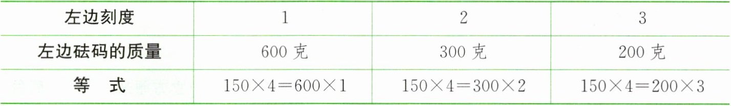 (2)如果右边的塑料袋放150克的砝码,放在刻度4上,为了保持平衡,左边应该怎么放?下面是一些实验数据。
