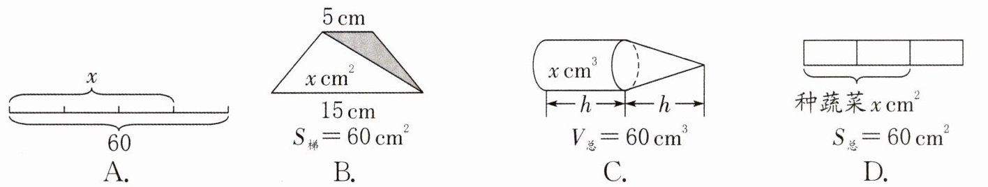 1. 下面不能用方程“$\frac{1}{3}x+x=60$”来表示的是(