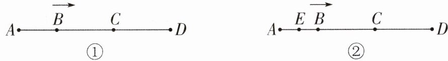 1. 新趋势 说理表达 线段上的一点把线段分成相等的两部分,这个点叫作线段的中点。如图①,B是线段AD上的一个动点,从点A到点D以2厘米/秒的速度运动,C是线段BD的中点,$AD = 10$厘米。