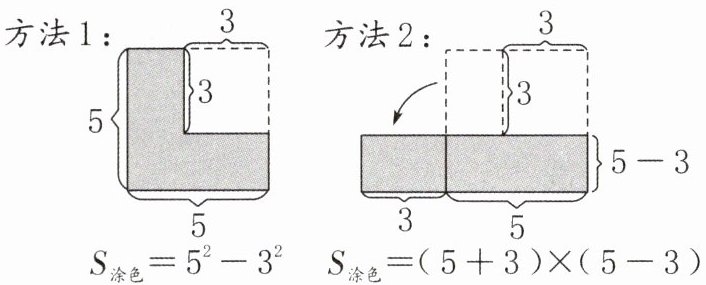 3. 新趋势 操作探究 “观察—猜想—验证—结论—应用”是我们常用的数学探究方法。婷婷在边长为5的正方形纸片上剪去一个边长为3的小正方形,婷婷想出了两种不同的方法求剩余部分的面积(如图)。从中可以得到:$5^{2}-3^{2}=(5+3)×(5-3)$。观察这个等式的特征,回答问题。