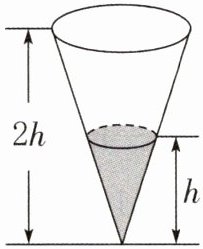 4. “小老鼠,上灯台,偷油吃,下不来。”有一个圆锥形容器装满了 2000 毫升香油,小老鼠偷偷在容器的正中间咬了一个洞偷油吃,一直到油面与洞口平齐为止(如图),此时油面直径是容器底面直径的$\frac{1}{2}$。(容器厚度忽略不计)