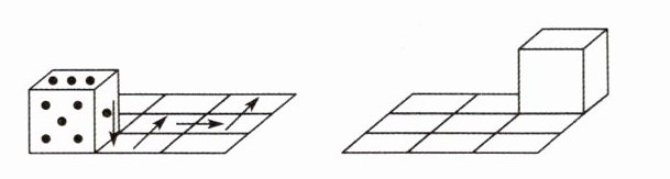 1. 一个正方体相对的面分别是 1 点和 2 点、3 点和 4 点、5 点和 6 点。游戏规则:在方格棋盘上沿棱按照箭头方向滚动正方体,每次不能后退。开始时正方体按如左下图所示的方式摆放,最后滚动到如右下图所示的位置,此时正方体朝上的点数是(