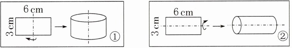 圆柱②:以6cm边为轴旋转,底面半径$r_2=3\,\mathrm{cm}$,高$h_2=6\,\mathrm{cm}$