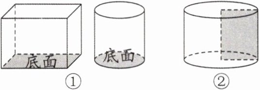 1. 新素养 空间观念 一个平面图形经过平移或旋转可以形成立体图形。如分别将长方形、圆作为底面,向上平移可以得到长方体、圆柱(如图①)。又如将一个长 4 cm、宽 3 cm 的长方形,绕着长旋转一周,也可以得到一个圆柱(如图②),这个圆柱同时可以看作是将一个底面半径是(