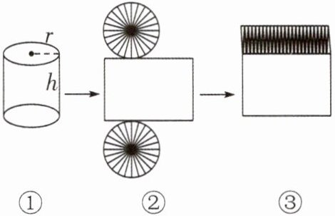 4. 新趋势 操作探究 小明将“圆”的知识应用到圆柱中,他先把一个圆柱(如图①)展开并将展开图中的两个圆等分切开(如图②),再拼接成一个近似的长方形,并与侧面展开后的长方形拼成一个大长方形(如图③)。由此得到圆柱表面积的另一种算法。