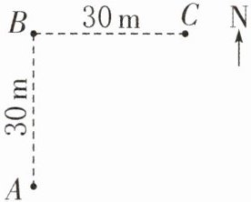 3. 亮亮从A点出发,向北走30m到达B点,再从B点向东走30m到达C点(如图)。亮亮回头看A点,发现A点在C点的(