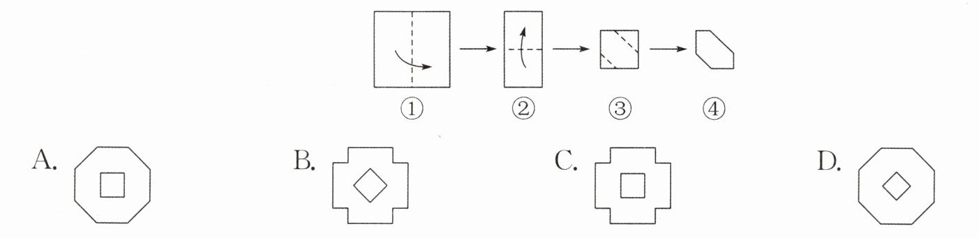 4. 新情境 传统文化 剪纸是我国传统的民间艺术。将一张正方形纸片按图①、图②中的方式沿虚线依次对折后,再沿图③中的虚线裁剪,最后将图④中的纸片打开铺平,得到的图案应该是(