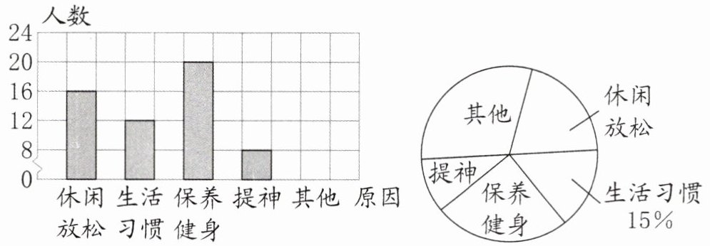 2. 新素养 数据意识 我国茶文化始于汉、兴于唐、繁于宋,是承载历史和文化的“中国名片”,也是中华文明与世界其他文明交流互鉴的重要媒介。萌萌想了解周围人喝茶的原因,于是在社区调查了一些有喝茶习惯的居民,并根据调查结果绘制了两幅统计图(如图)。