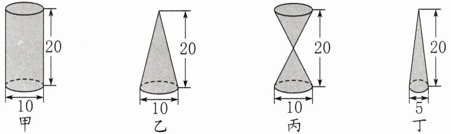 丁(圆锥):$r=\frac{5}{2}$,$h=20$,$V_{\mathrm{丁}}=\frac{1}{3}\pi×(\frac{5}{2})^{2}×20=\frac{125}{3}\pi$,$V_{\mathrm{乙}}=4V_{\mathrm{丁}}$,③错误;$V_{\mathrm{甲}}=12V_{\mathrm{丁}}$,④正确。